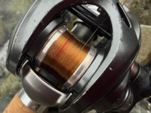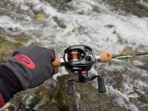 PE素材やナイロン素材は比重が1前後なので重たいフロロカーボンよりも数gの軽いルアーがグッと投げやすいので渓流ベイトでは定番スタイル。